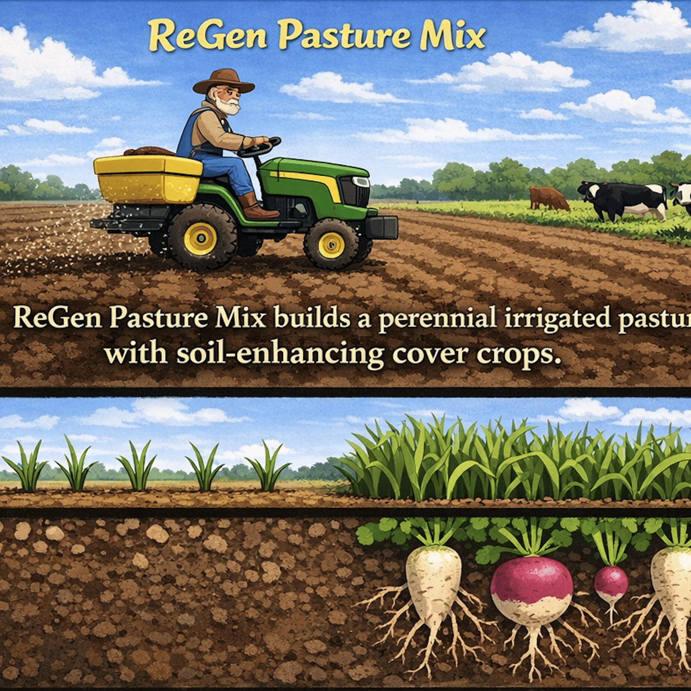 ReGen Pasture Grass Mix is a combination of proven perennial forage grasses and cover crops. It is an economical way to establish pasture AND improve soil health. How it works: