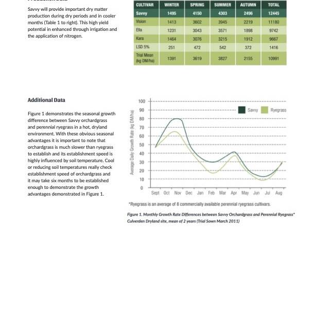 Savvy has been bred to lift the seasonal growth over other orchard grasses while holding pasture quality. Savvy is particularly strong for dry matter production in late spring and summer while maintaining high growth rate potential in autumn and winter.